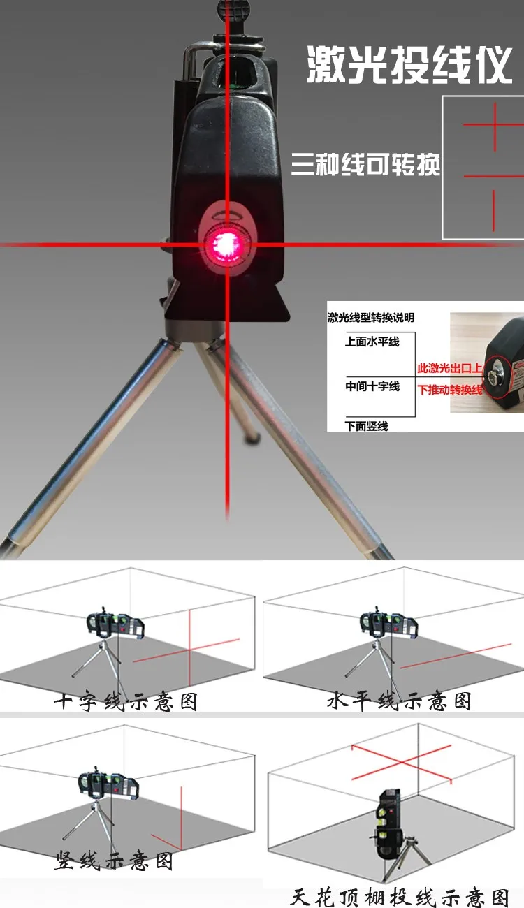 The first function: laser level can measure whether flat or uneven paintings, etc., LV03 laser level can play three kinds of lines: a word line, cross line combined firm line (also known as moldings).