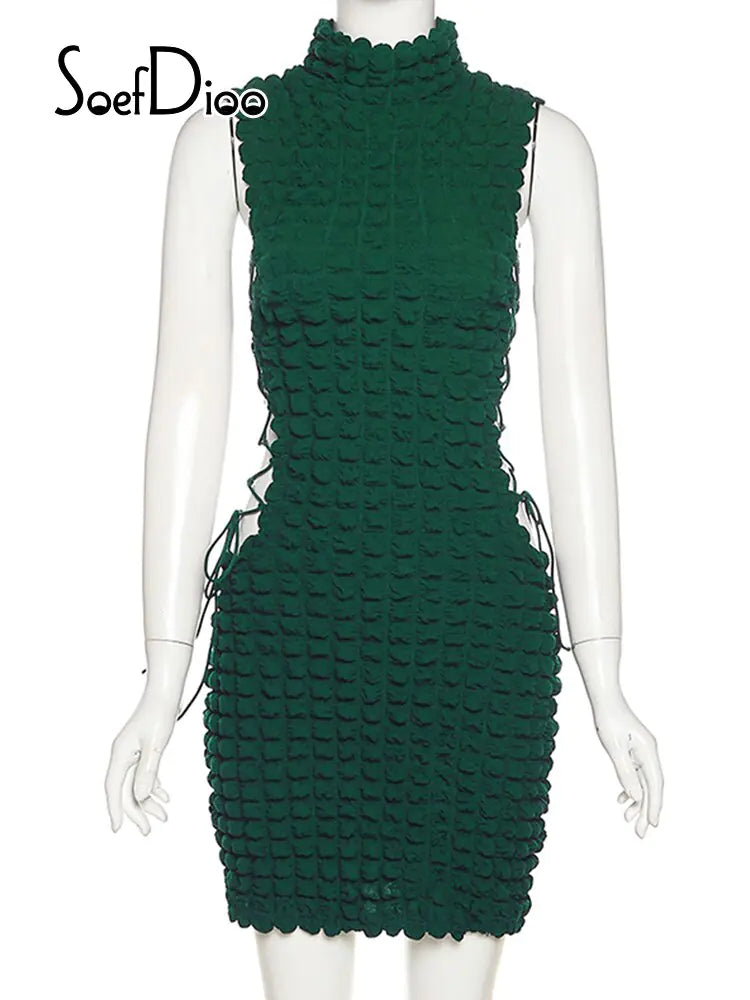Elevate your autumn style with this chic lace-up dress. The hollow-out side details and seersucker fabric add a touch of elegance, while the sleeveless design keeps you comfortable. Perfect for layering or wearing on its own, this dress is your new go-to for versatile, stylish outfits.