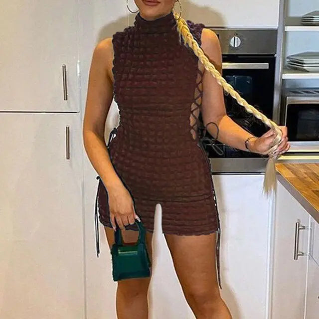 Transform your look with this stunning lace-up seersucker dress. Featuring fashionable hollow-out sides and a sleeveless cut, it's designed for the modern, stylish woman. Pair it with your favorite accessories and shoes for a look that's both trendy and comfortable.