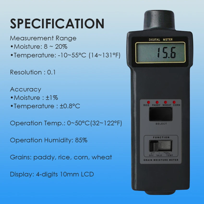 Measurement Range: Moisture: 8 ~ 20% Temperature: -10 ~ 55 deg.C (14 ~ 131deg.F)