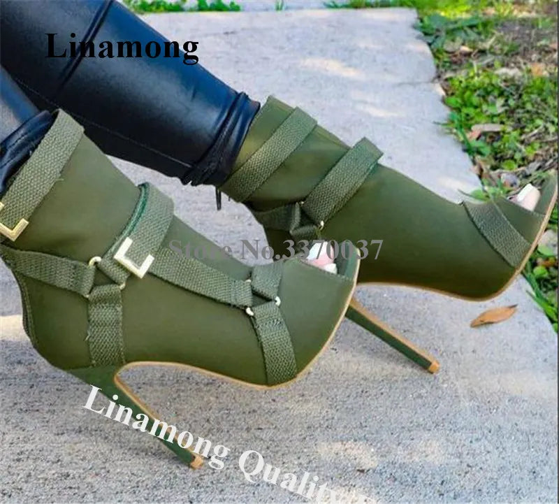 New Design Women Fashion Peep Toe Suede Leather Stiletto Heel Short Boots Buckles Strap Black Army Green High Heel Ankle Booties