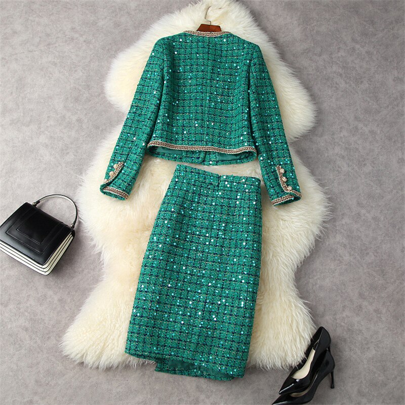 Looking for a sleek and chic winter outfit that will make you stand out from the rest? Look no further than the Runway Winter Tweed Dress Set! This gorgeous two-piece set features a striking green tweed jacket with sequined details, paired with a matching skirt. The perfect outfit for any office party or holiday event, you'll be sure to turn heads in this chic and stylish ensemble. Made from a wool blend fabric, the jacket and skirt are both lined for warmth and comfort. The jacket has a single button closure, while the skirt has a concealed back zipper. Dry clean only.
